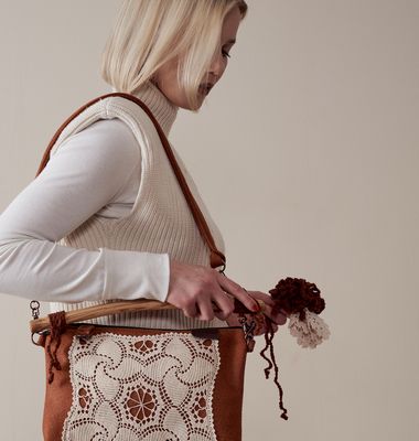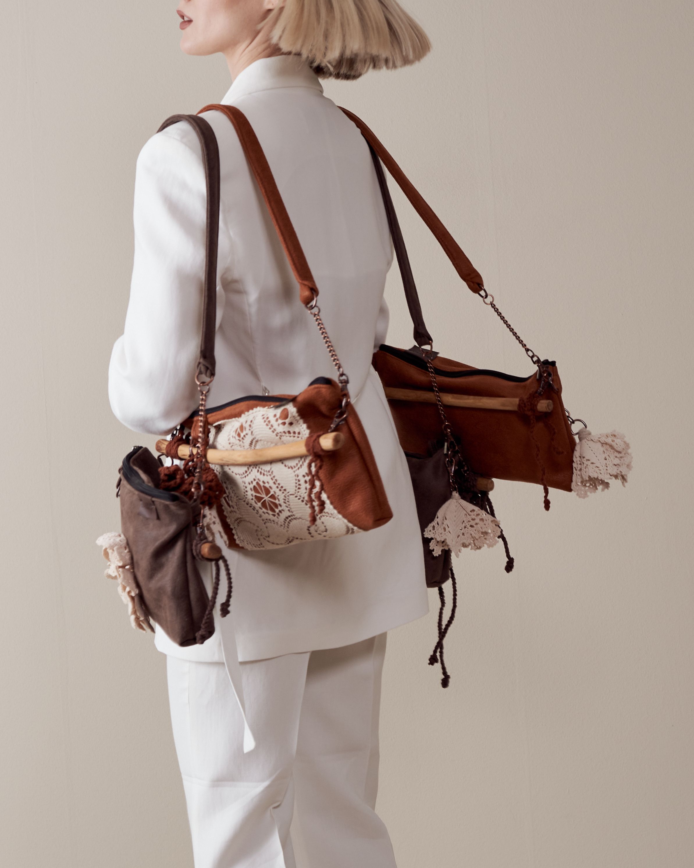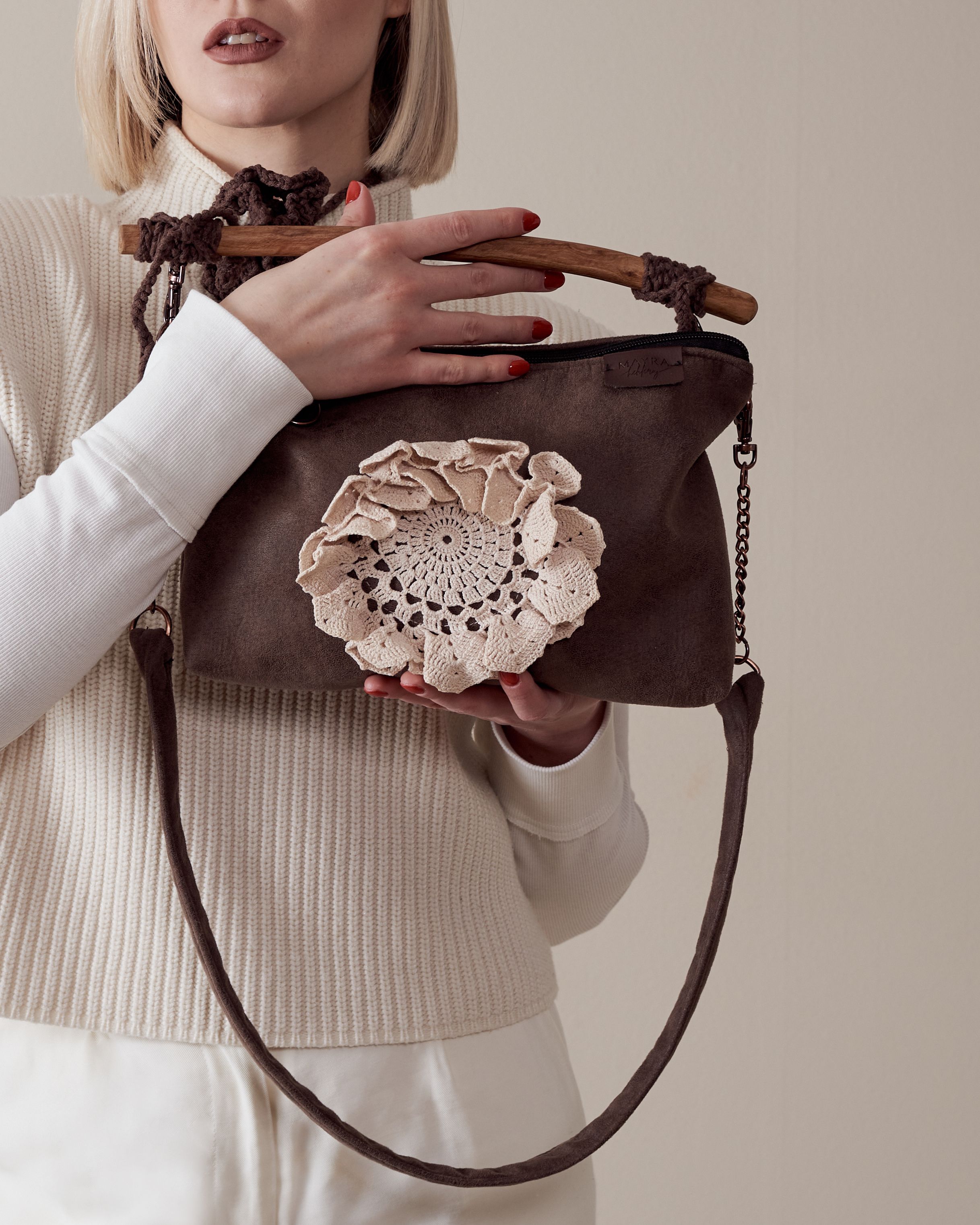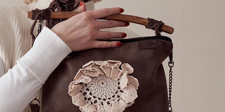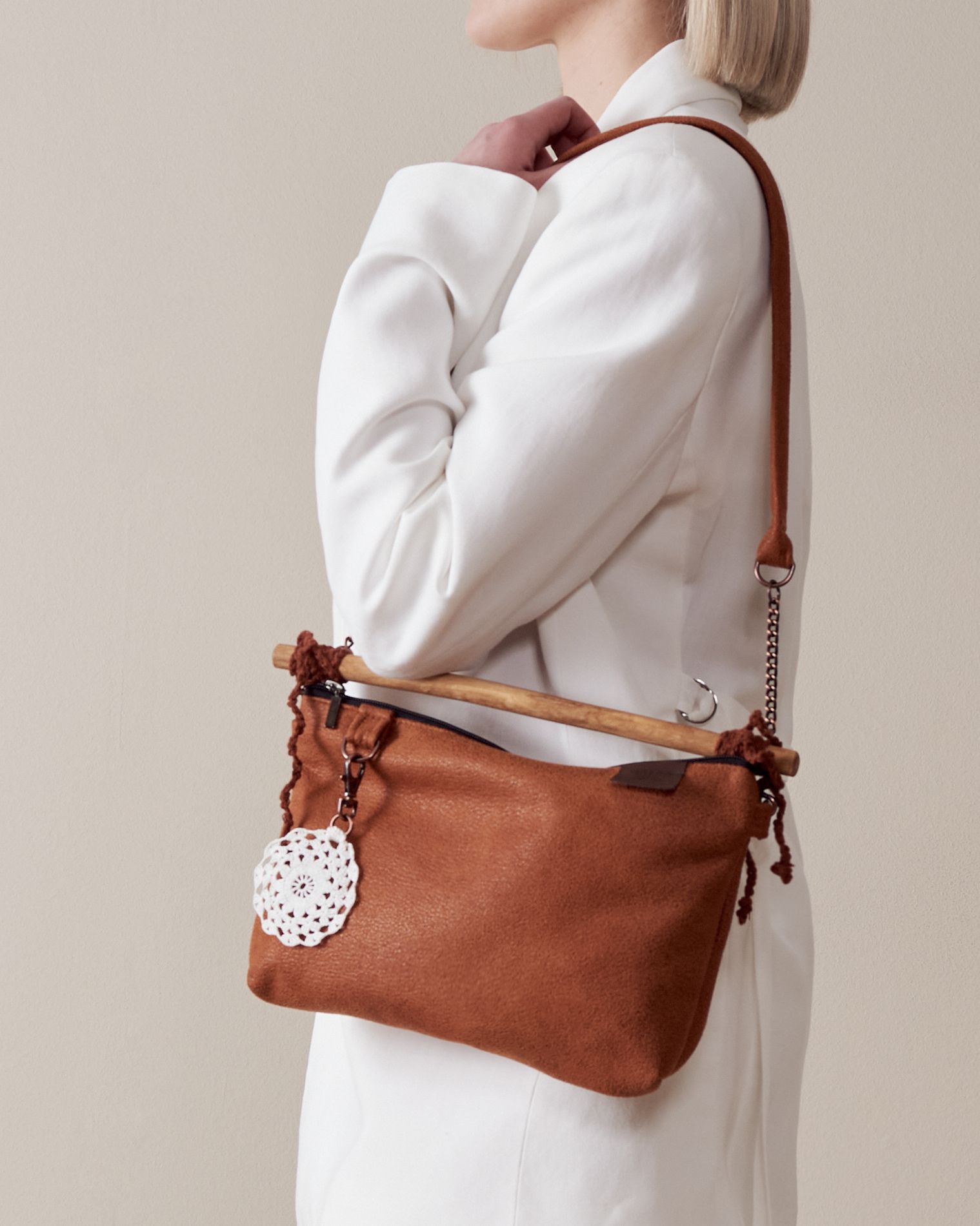 Tkanina koja teksturom podsjeća na kožu, u toplim smeđim i konjak tonovima, kukičani detalji i ručka od masline.