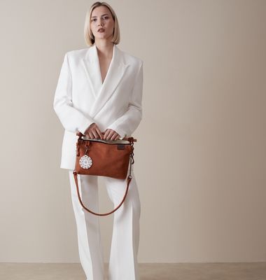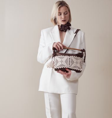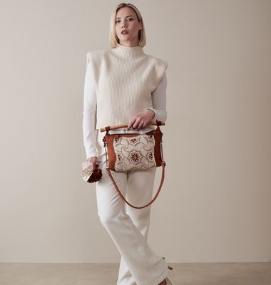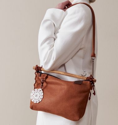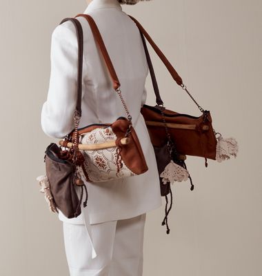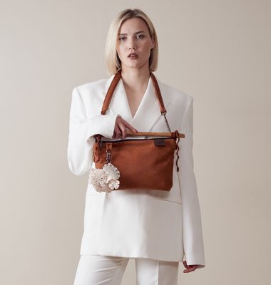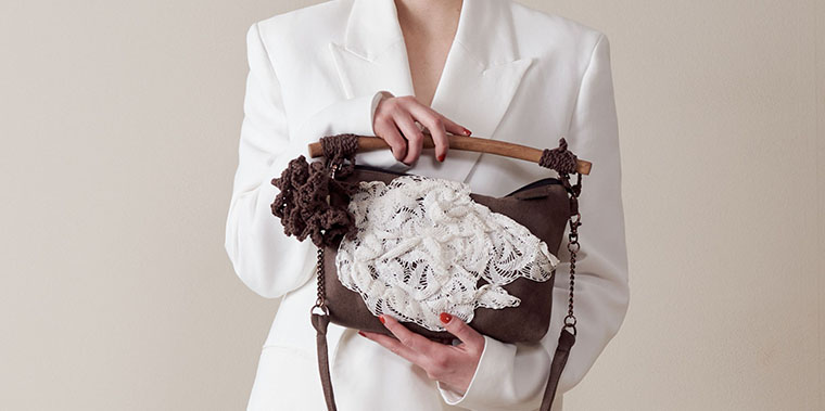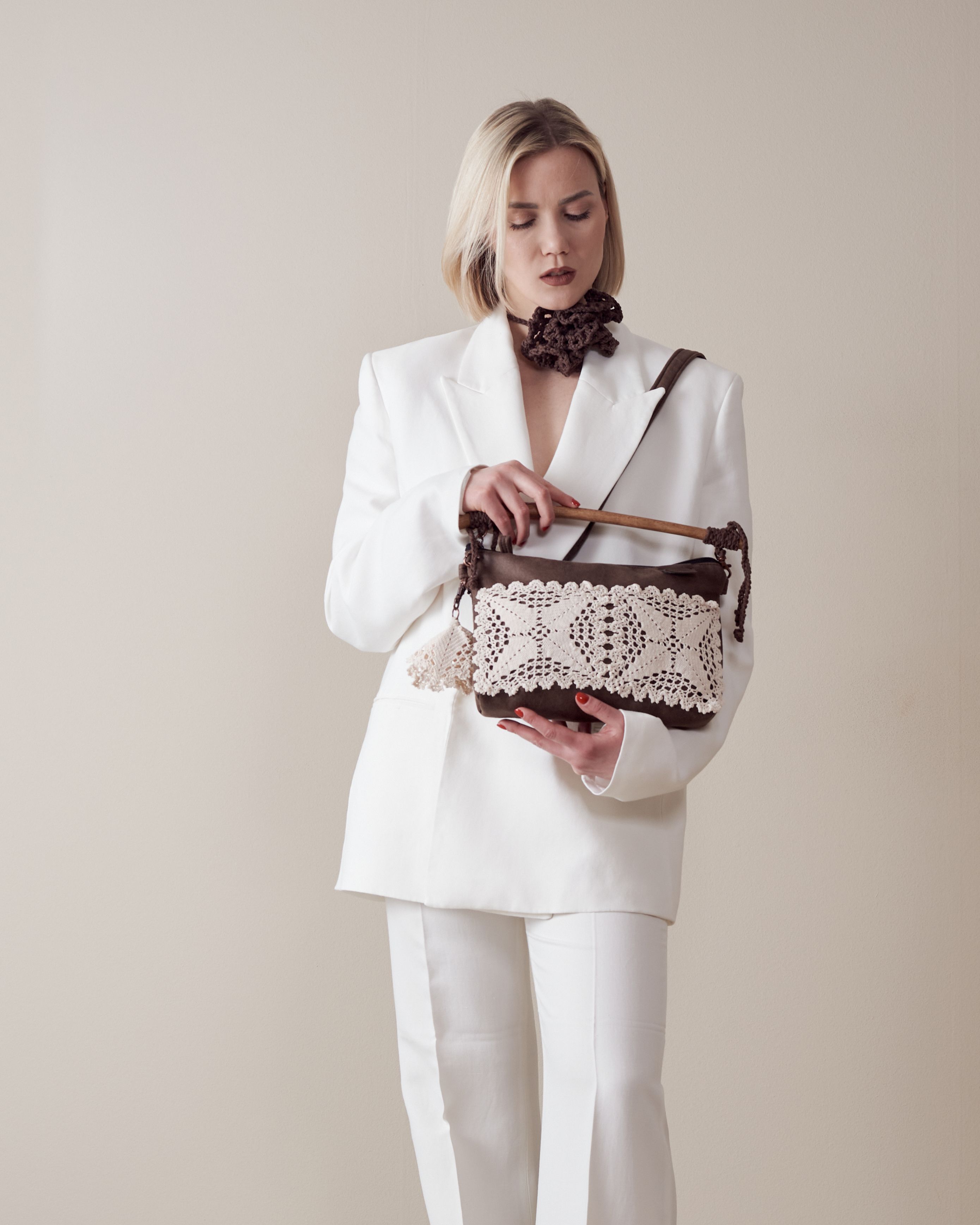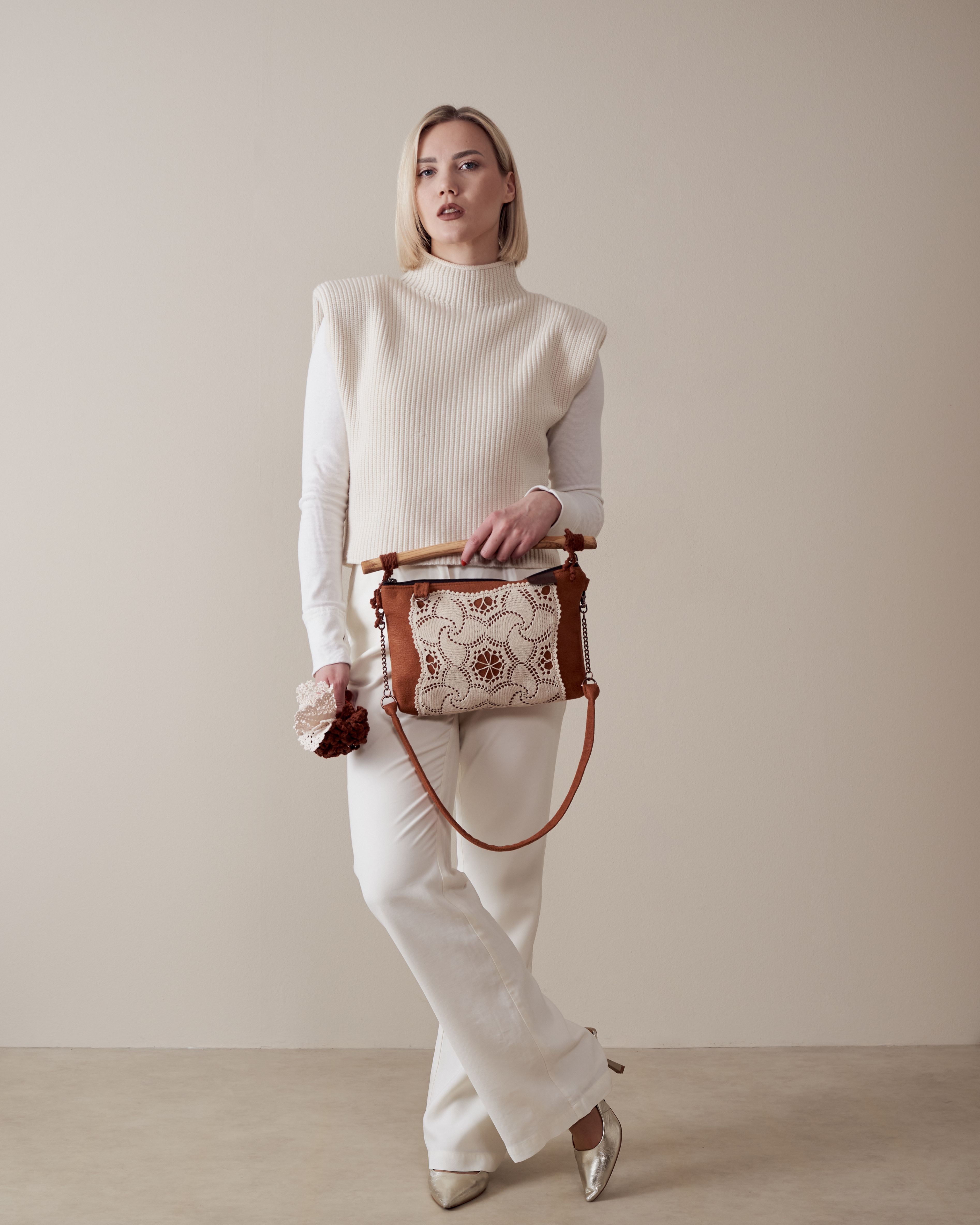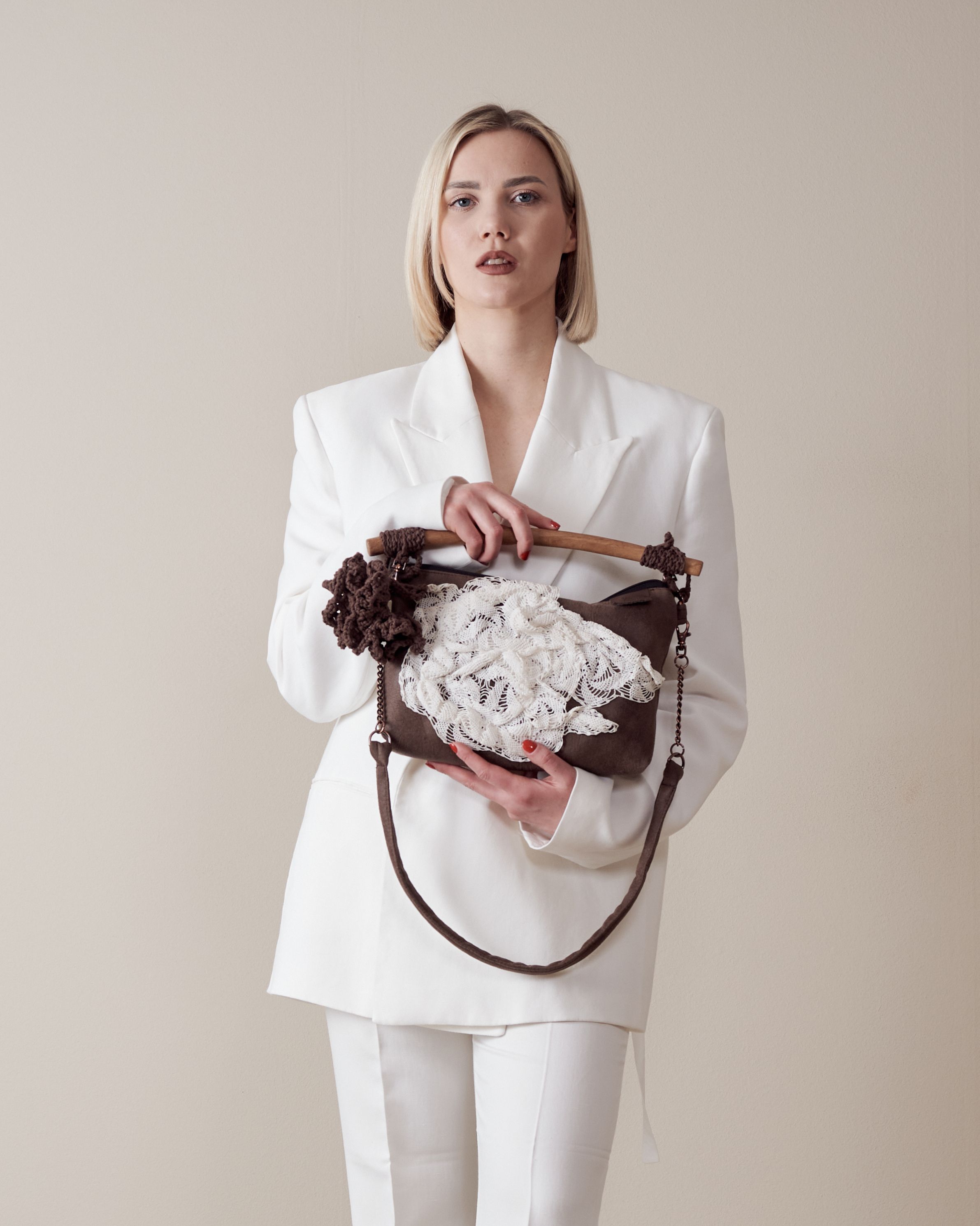 Tkanina koja teksturom podsjeća na kožu, u toplim smeđim i konjak tonovima, kukičani detalji i ručka od masline.